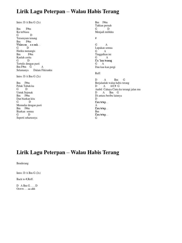 Kini, peterpan berganti nama menjadi noah. Walau habis terang adalah satu dari total 30 lagu dalam album studio kelima sekaligus terakhir dari peterpan, sebuah nama, sebuah cerita, yang dirilis pada 2008 melalui label musica studio's. C g am f 2x am em f c am em ku tak biasa tersenyum tenang walau a.a.a f c hatiku menanggis am em f c kaulah cerita tertulis dengan pasti am em f g selamanya dalam pikiran ku c g am f c g am f selamanya. Berikut ini adalah lirik dan chord lagu walau habis terang. C g am f 2x.